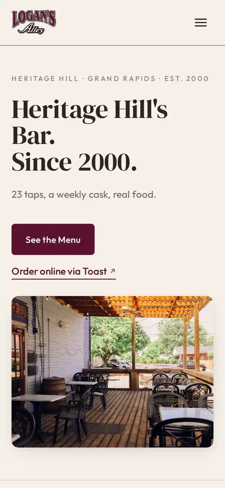 A Heritage Hill neighborhood pub in Grand Rapids. Warm cream + burgundy palette, a live Cask Friday countdown, and a tight three-page layout in the kind of typography that reads like the sign outside. Nothing extra. Everything right.